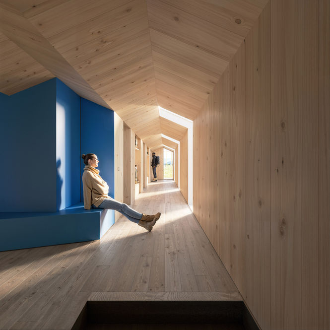 Il legno bruciato del piano terra è una scelta insieme simbolica e funzionale: custodisce la memoria dell’incendio e la trasforma in forza costruttiva; il larice naturale del piano superiore, mutevole alla luce ed al tempo, contribuisce a fondere l’edificio con il paesaggio.